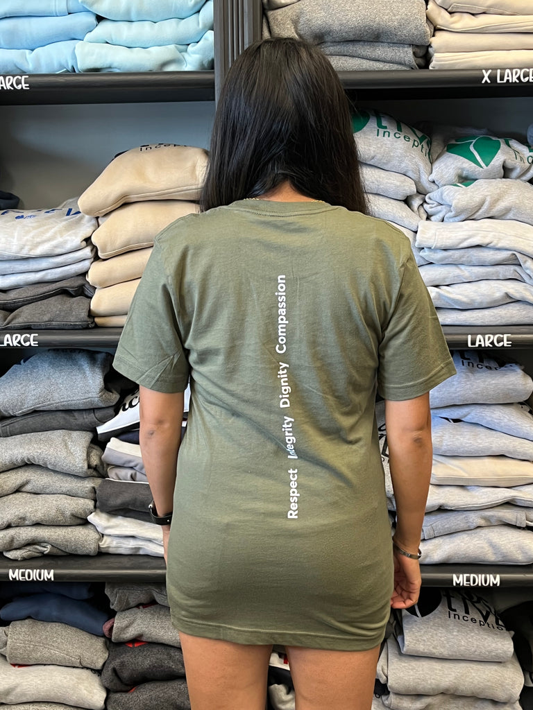 We have integrated the hospice heart into our logo and added their core values as a powerful message on the back of the shirt: Compassion, Dignity, Integrity, Respect