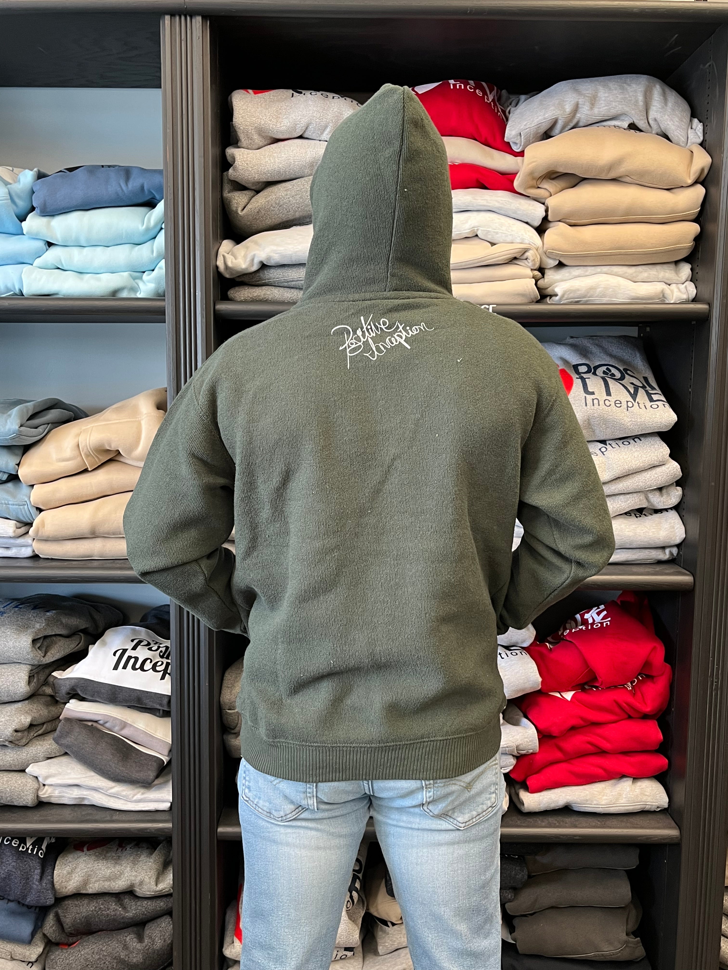 Charcoal Grey Hoodie with a Yellow Positive Inception logo! (50% Polyester/50% Combed Cotton Nantucket Fleece).