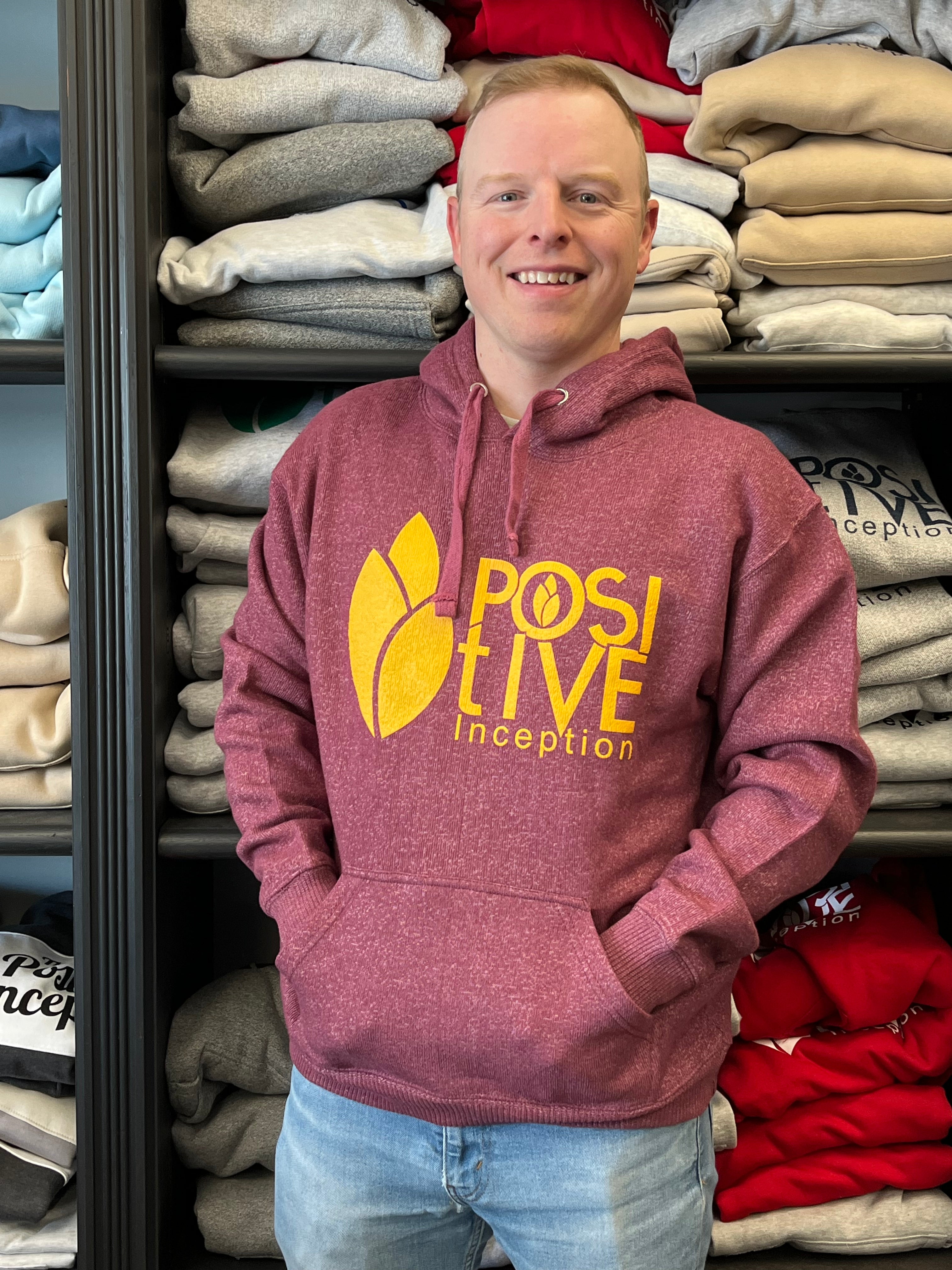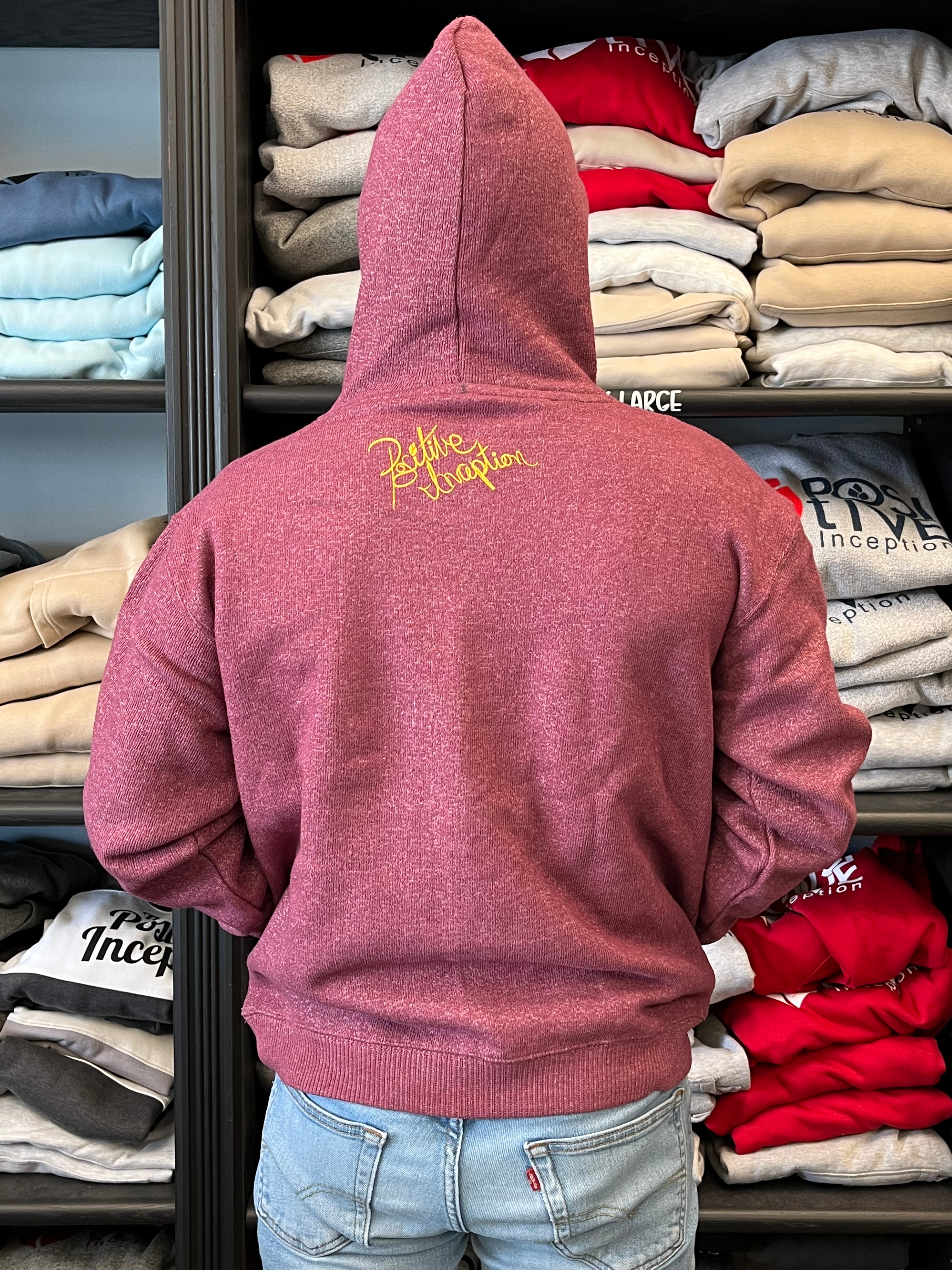 Charcoal Grey Hoodie with a Yellow Positive Inception logo! (50% Polyester/50% Combed Cotton Nantucket Fleece).